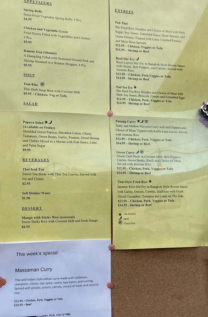 We had the special of the day which was a Massaman Curry(12.95) which is a “Thai and Indian style yellow curry.” That is made with cardamon, cinnamon. cloves, star spice, cumin, bay leaves, and nutmeg. The Massaman Curry was served wiht potato, onions, carrots along with Jasmine rice. You could choose chicken, pork, veggies or tofu. For an upcharge of 2 dollars you could have beef.