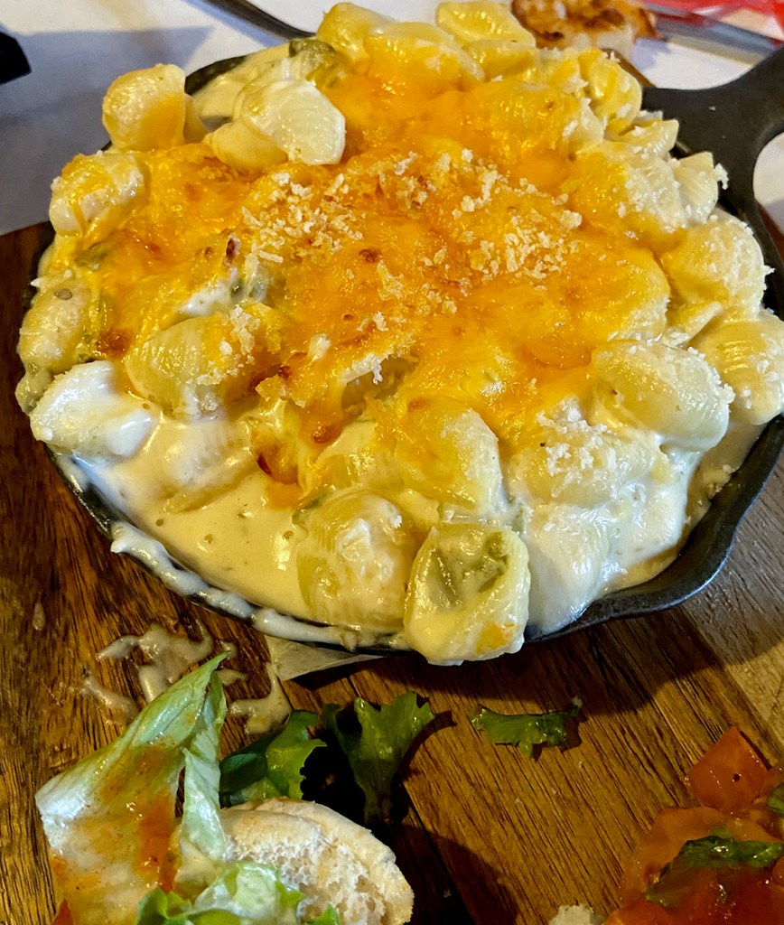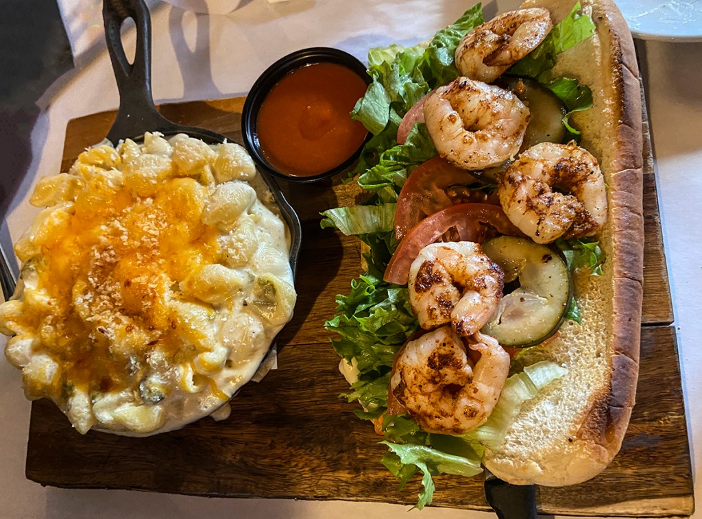 The shrimp po’boy(15.99) was our other meal option. It was 15.99, a dollar less than what was quoted on the website. As with the hamburgers, with the shrimp Po’boy you could pick your sides. For an upcharge of 2.50, you received a large bowl of Mac and Cheese. We also added green chile(1.00) to the Mac and Cheese. Wow! You know the chef is serious when they present any food in a small skillet. There was also an incredibly hot Bang sauce for the shrimp po’boy. Man, it was hot. You could have your shrimp grilled or fried. We chose the grilled option.