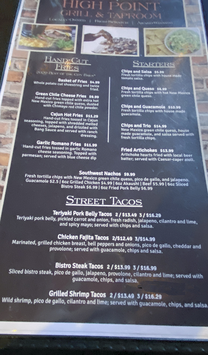 This is how I found High Point Grill, I googled the best restaurants around Cottonwood Mall. I am not very familiar with the west side of Albuquerque. Ok, I know about Toltec Brewing, Urban Hot Dog Company, and the late great Stumbling Steer but that is the extent of my restaurant knowledge of the westside. We decided that our trip to the west side should be a food adventure. I’m really glad that we did. This is a little gem of a restaurant. It was hard to find on Coors, but it was certainly worth the effort.
