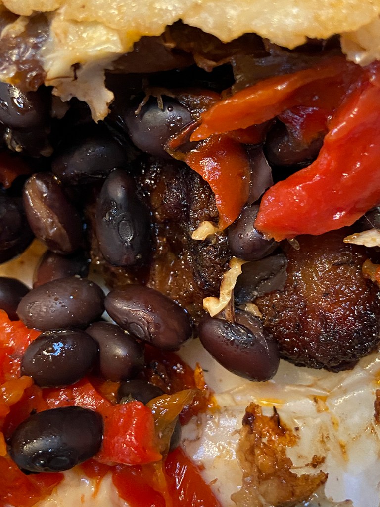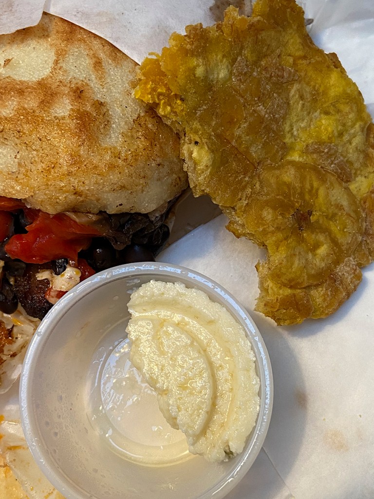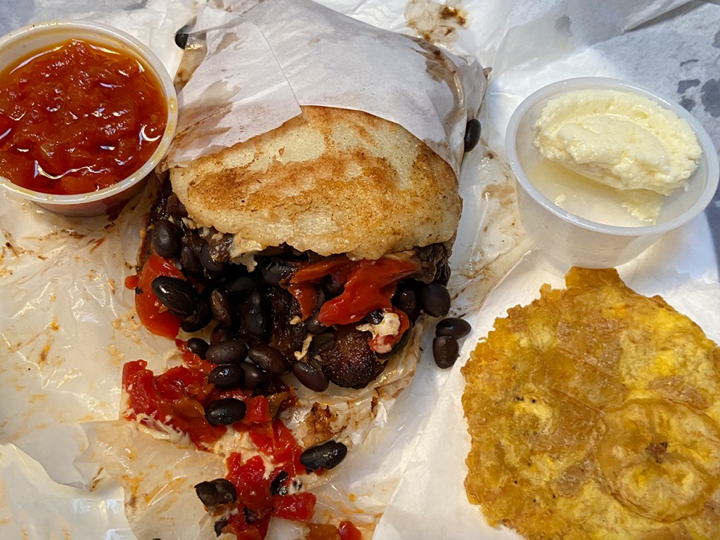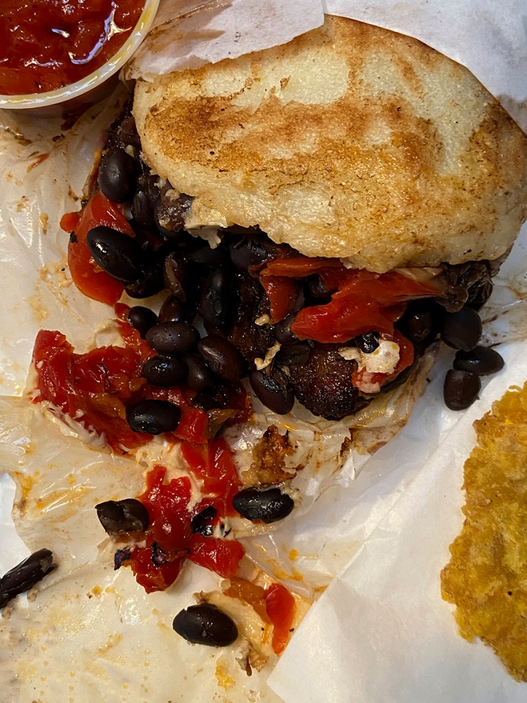 You get to see all the black bean goodness of incredible arepa. This baby was really stuffed with vegetables. Wow! I have never had such a large arepa. It was huge and also so very delicious. Our arepa was also gluten-free. If I would have remembered to ask to hold the cheese, our arepa would have been vegan as well. I will remember next time.
