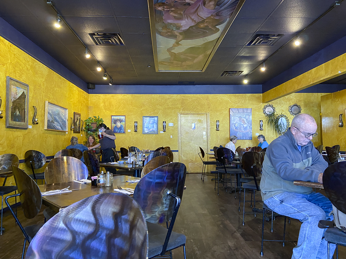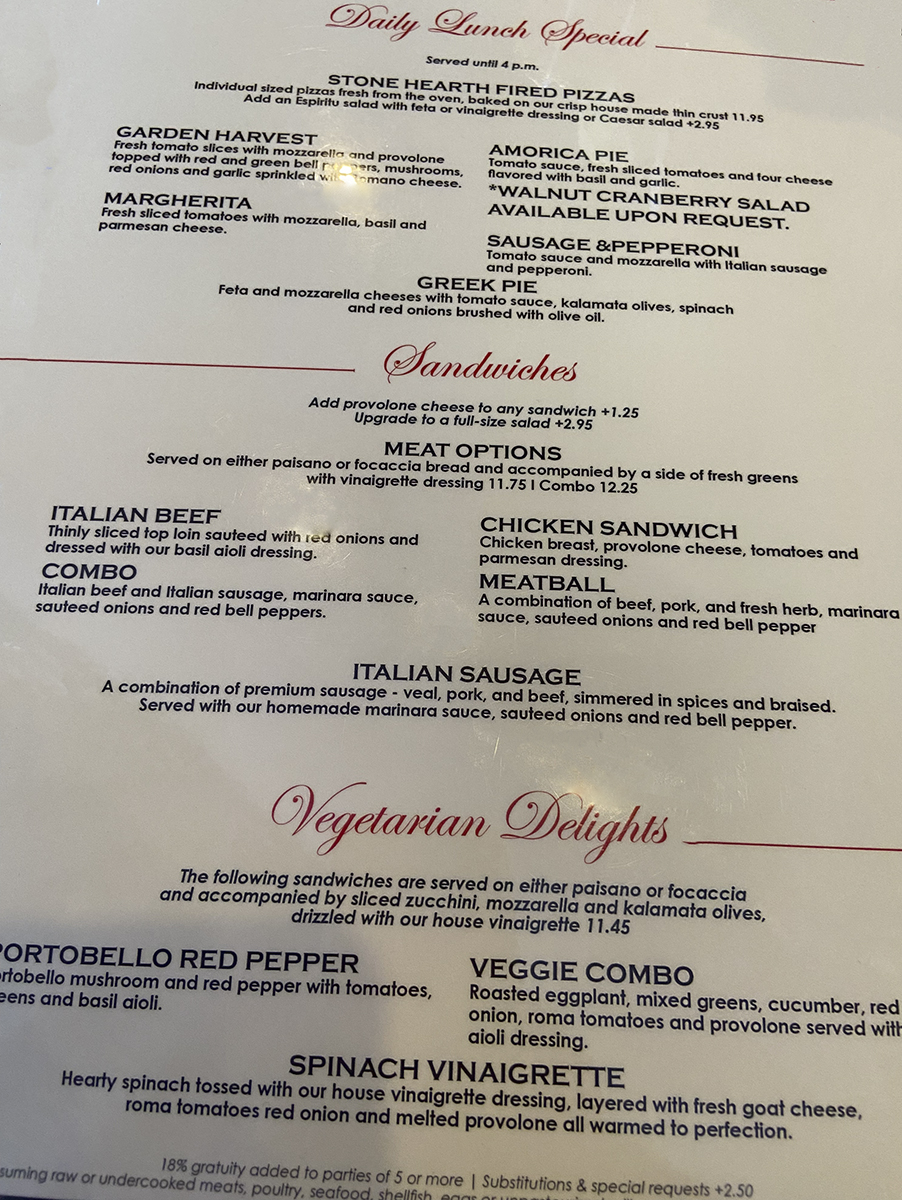 Pizzeria Espiritu’s lunch specials are til 4. More and more people came in around 12. We were a little early because we are still not comfortable about eating inside busy restaurants. Just me. We were masked as was the delightful server. The tables are still stacked up for outside eating. So patio dining will probably be an option soon.