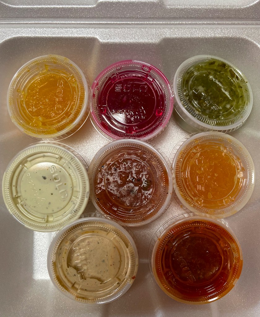 I got one of each. The vegan sweet potato taco was a crispy sweet potato glazed with non bee honey and topped with guacamole, a creamy house chipotle hummus and a Jerusalem salad. This taco was both gluten-free and vegan. It was delicious in its soft corn taco. They gave us some small limes to add to the flavor of the taco. The battered avocado was lightly battered(always a plus). It was fried in a light crispy batter and finished with a baja slaw and their house crema. I asked for the vegan version. It was delicious as well. If I had to pick, I would choose the sweet potato as my favorite taco. Although that was a hard choice. Another hard choice was picking out a salsa.