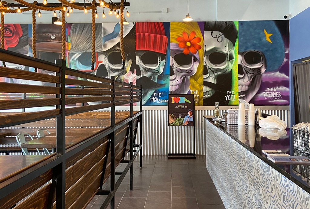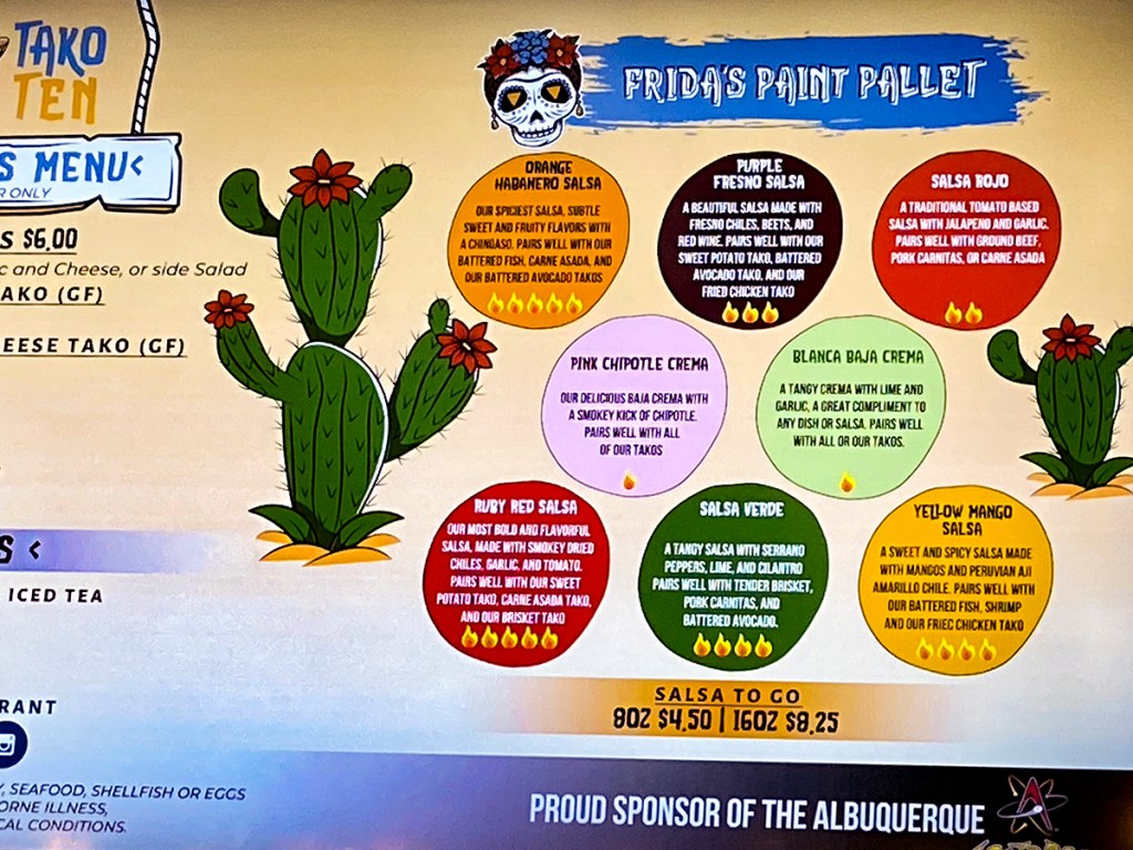 I had never heard of Tako Ten until I went to an Albuquerque Isotopes Baseball game. If the Isotopes scored 10 or more runs the crowd received a card that entitled them to two free tacos from Tako Ten. So we were lucky that the Isotopes scored more than 10 runs. Yes! we received a card for free tacos. The catch was that we would have to redeem this at the original location at 12501 Candelaria Rd NE in Albuquerque. I thought that we could check out the new location of Tako Ten on Montgomery since it was a lot closer than the Candelaria location. If the tacos were good, we would eventually venture to the original location. I really was impressed with the Mural along the west wall inside the restaurant. It was colorful and interesting. It gave the restaurant an original feel, one that I really enjoyed.