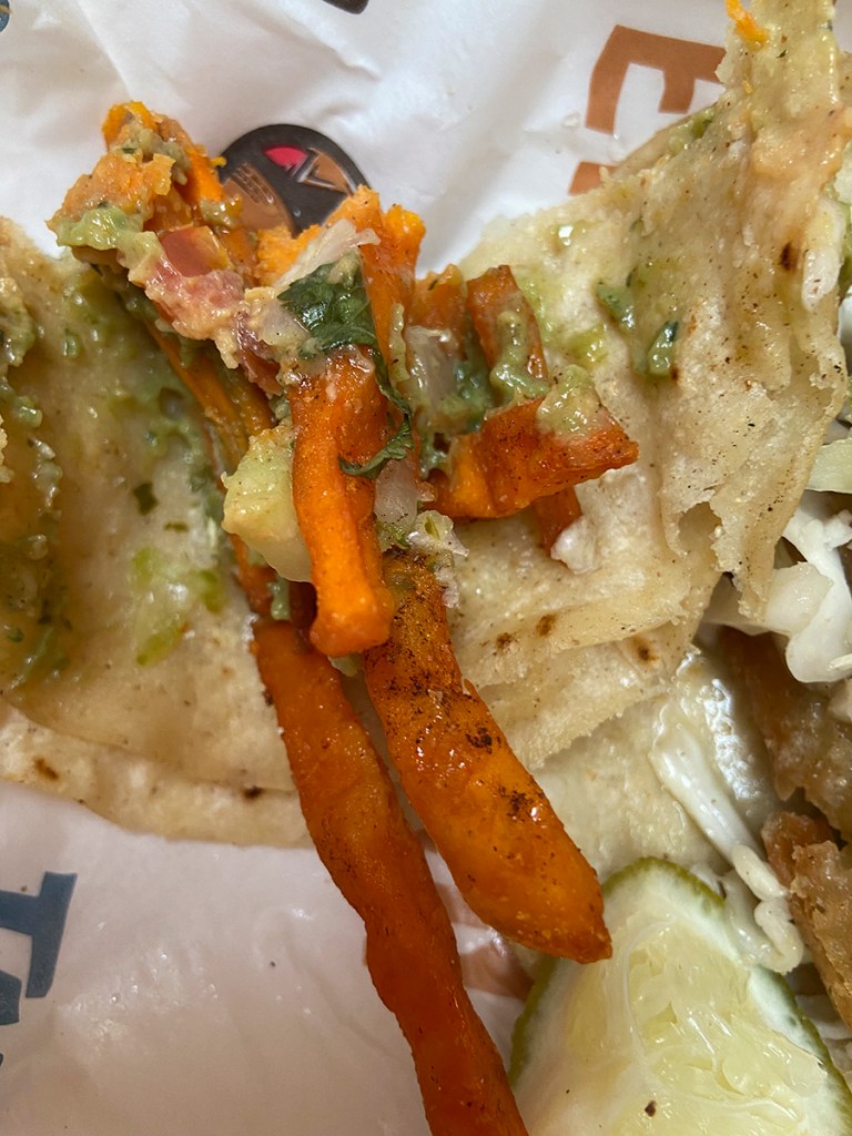 Since I had looked at the menu online, I was almost ready to order. When I am visiting a restaurant for the first time, I like to ask questions about the food. I was very pleased that there were two vegan options on the menu, the vegan sweet potato and the battered avocado tacos.