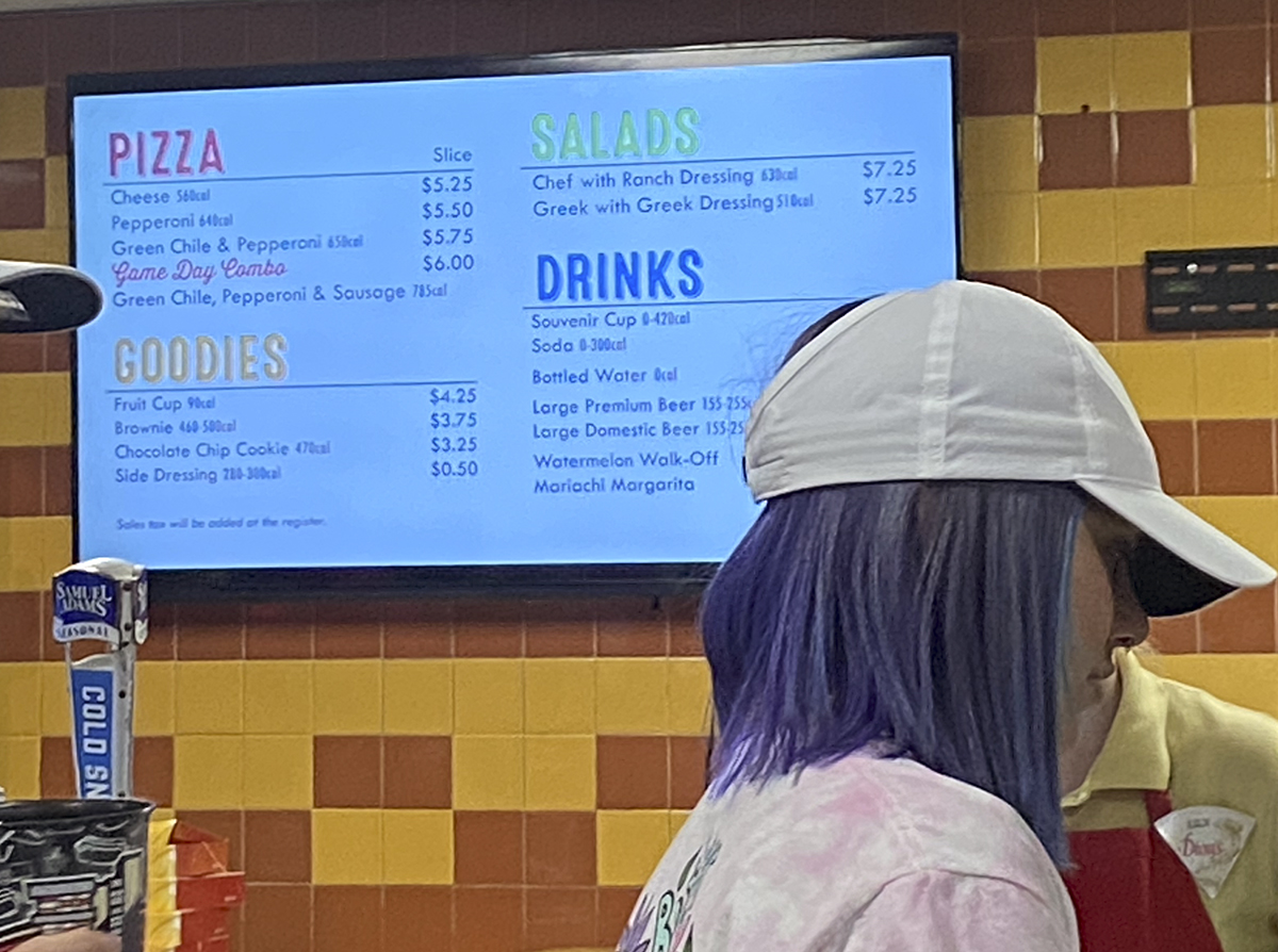 Now back to the food. We had a slice of cheese pizza(5.25). We were told we couldn’t add green chile. I think it would have been hard and would have slowed down the line. We were told about the condiment table so we could add onions, salsa, or jalapenos. The condiment tables are well stocked throughout the game and were close by to the concession stands.