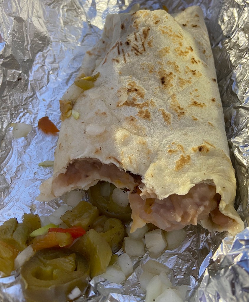 The soft warm tortilla and the beans were a wonderful comfort food and easy to eat at the ballpark.