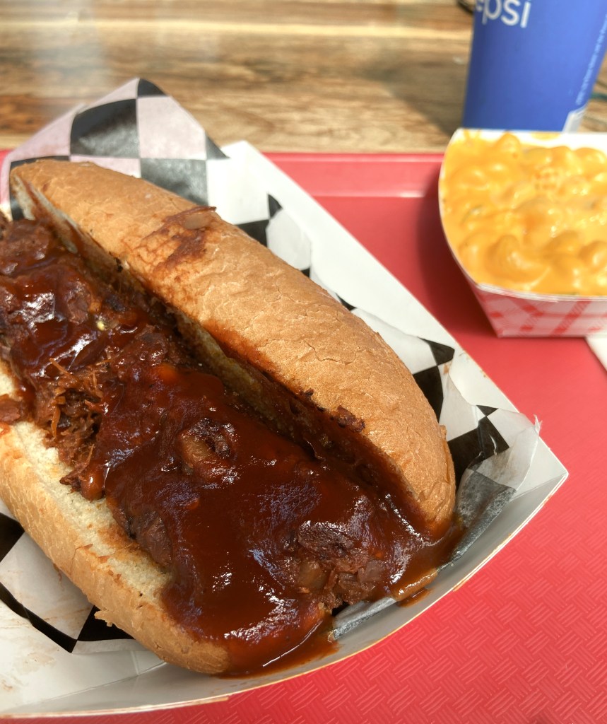 Ok, it tastes like pork or rather a mild version of what I remember pork tasting like. I was asked if I wanted BBQ sauce and of course I said Yes! The BBQ sauce is what makes the jackfruit, pork, chicken, ribs a BBQ dish. As you can see, they were generous with their sauce. I decided to also check out SA BBQ’s green chile Mac and Cheese along with an iced tea. Well, SA BBQ only had soft drinks no iced tea. It was a little early in the day for a beer so I settled on a Dr. Pepper. Adding the mac and cheese along with the Dr. Pepper cost 3.50 to my order.