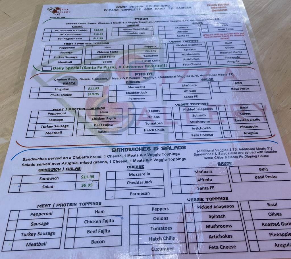 I think this was very clever. As you turn to the left inside Santa Fe Pizza Gallery there are menus that you can fill out and present to the cashier.
