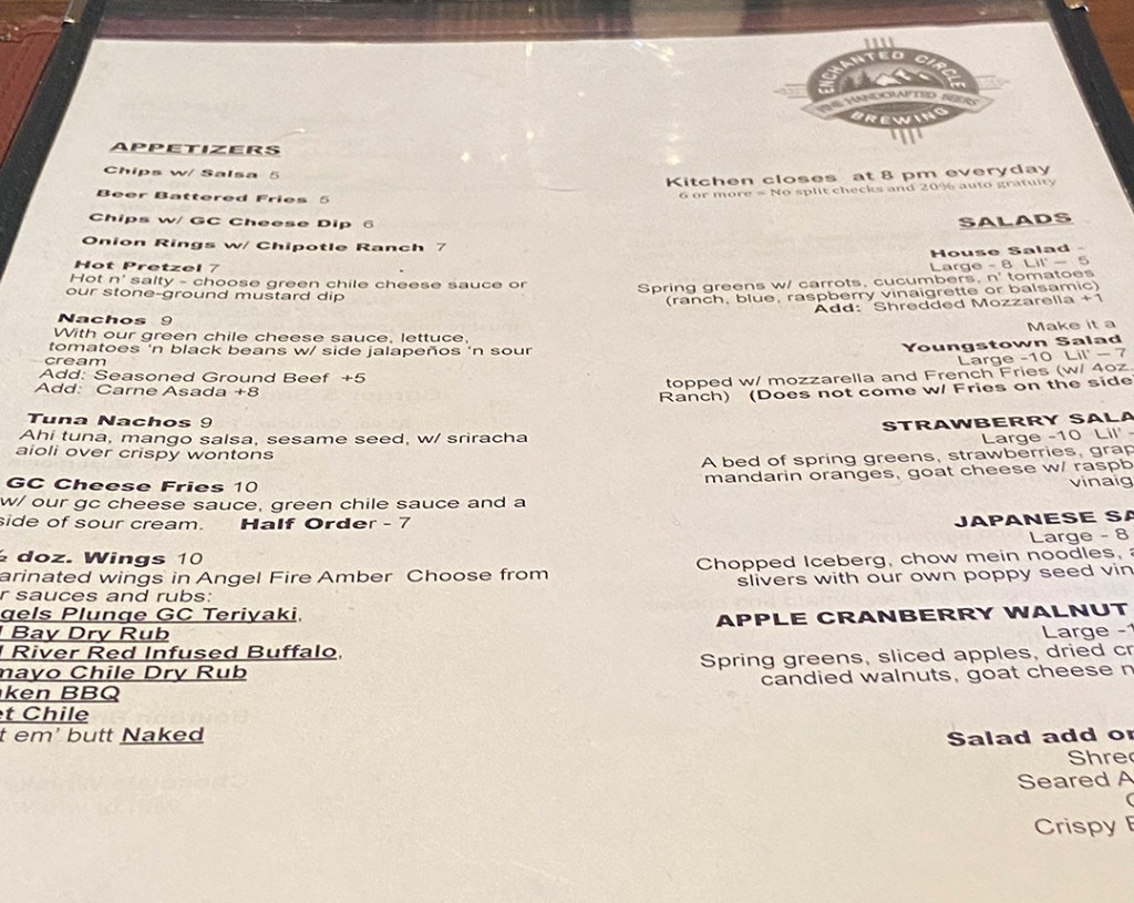 The menu online that I accessed was not current. We looked at Enchanted Circle Brewery and they said there was a hummus platter(9.95). There wasn’t. There were gator po-boys also listed and they were not on the menu either. What we received was so much better than what I expected. We will return.