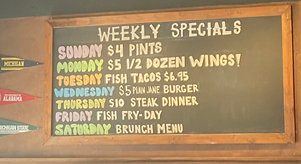 I like a neighborhood bar than has events and specials, even though I wasn’t interested in the steak or martini special(5). Ok, I admit it, I am a light weight when it comes to martinis in the afternoon. It is simply not happening. Maybe in the evening but doubtful even then. Just me.