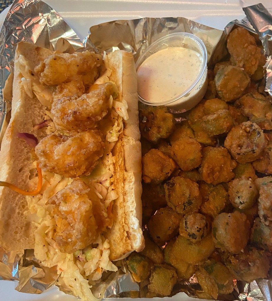 We hadn’t been to The Hollar in a long time so we decided to do take out there. This time I tried their Shrimp Po’ Boy(15.85). The online menu isn’t up-to-date. The Shrimp Po’ Boy is listed at 14.35. We didn’t know that a side was also included in this price which is why I received fried okra as my side.