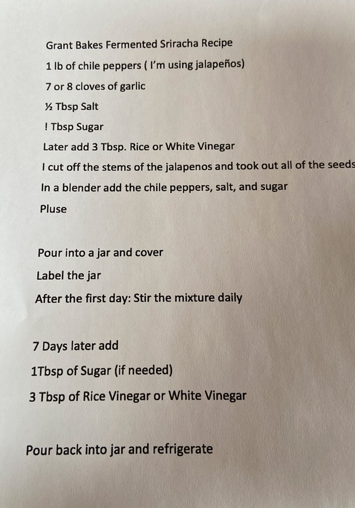 As luck would have it, I found an easy recipe on YouTube called Grant Bakes, How to make your own fermented sriracha. You can follow along. I sure did. Below is his recipe: