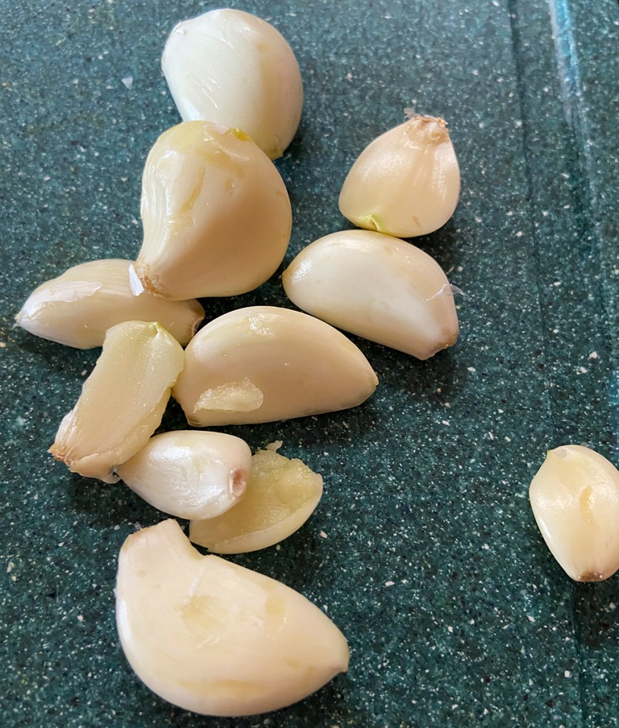 Next I peeled the garlic. Then I added the salt and the sugar to this mixture while I poured the peppers into a blender.